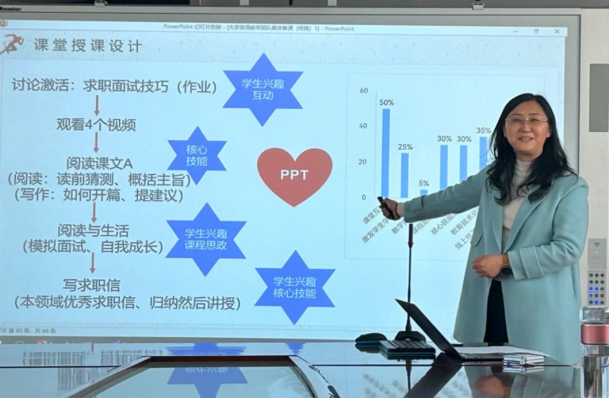 赵金宇老师是教育数字化高效转型的典范,她分享的题目是互动·平台·方法 ——课堂信息化思考与实践。她依托超星学习通、iWrite 和UTalk 平台,以POA和OBE为教学理念,通过破冰建组和合作的方式开展课堂互动,利用平台的各种手段提高学生的到课率、抬头率和参与率,通过学生课前展示和教师金句分享,以及集体备课的思政元素汇总全面培养学生的语言技能和综合素养。她的分享热情澎湃,在座的老师深深地感受到赵老师对学生和教学的热爱。