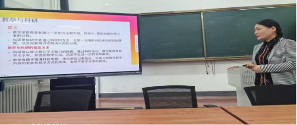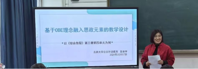 随后赵金宇老师以大学英语第三册第四单元为例,结合OBE教育理念老师老师们呈现了一堂生动的教学示范课。赵老师详细展示了四单元的教学设计思路、课堂教学活动、课堂后的教学延伸、学生的反馈方法以及如何思政元素自然融入课程设计。赵老师的分享充满激情极具感染力