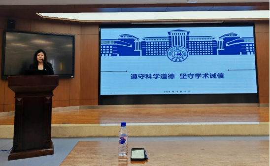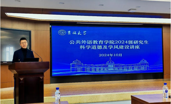 为督促研究生新生深入了解学术规范,遵守科学道德和学术诚信,杜绝学术不端行为,2024年10月10日上午,公共外语教育学院在外语楼500会议室举办2024级研究生科学道德及学风建设讲座。讲座由姜峰教授主持,杨梅教授主讲,研究生办公室主任李萌、研究生辅导员林明帅及2024级全体研究生新生参加。