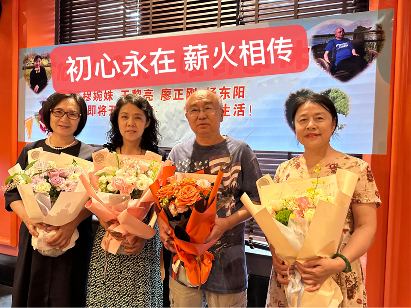倾尽丹心育桃李,奉献韶华铸师魂。为感谢穆婉姝、廖正刚、王黎亮、杨东阳四位教师为教育事业所付出的辛苦努力和无私贡献,第七支部全体党员同志与教研室全体教师于7月4日为四位教师隆重举行了荣退仪式。仪式上大家回顾了四位老教师几十年如一日坚守教育初心,坚持为党育人,为国育才的教学生涯,这种品格和精神激励着在职教师不忘初心,立足岗位,接续奋斗,实干争先,续写光荣! v