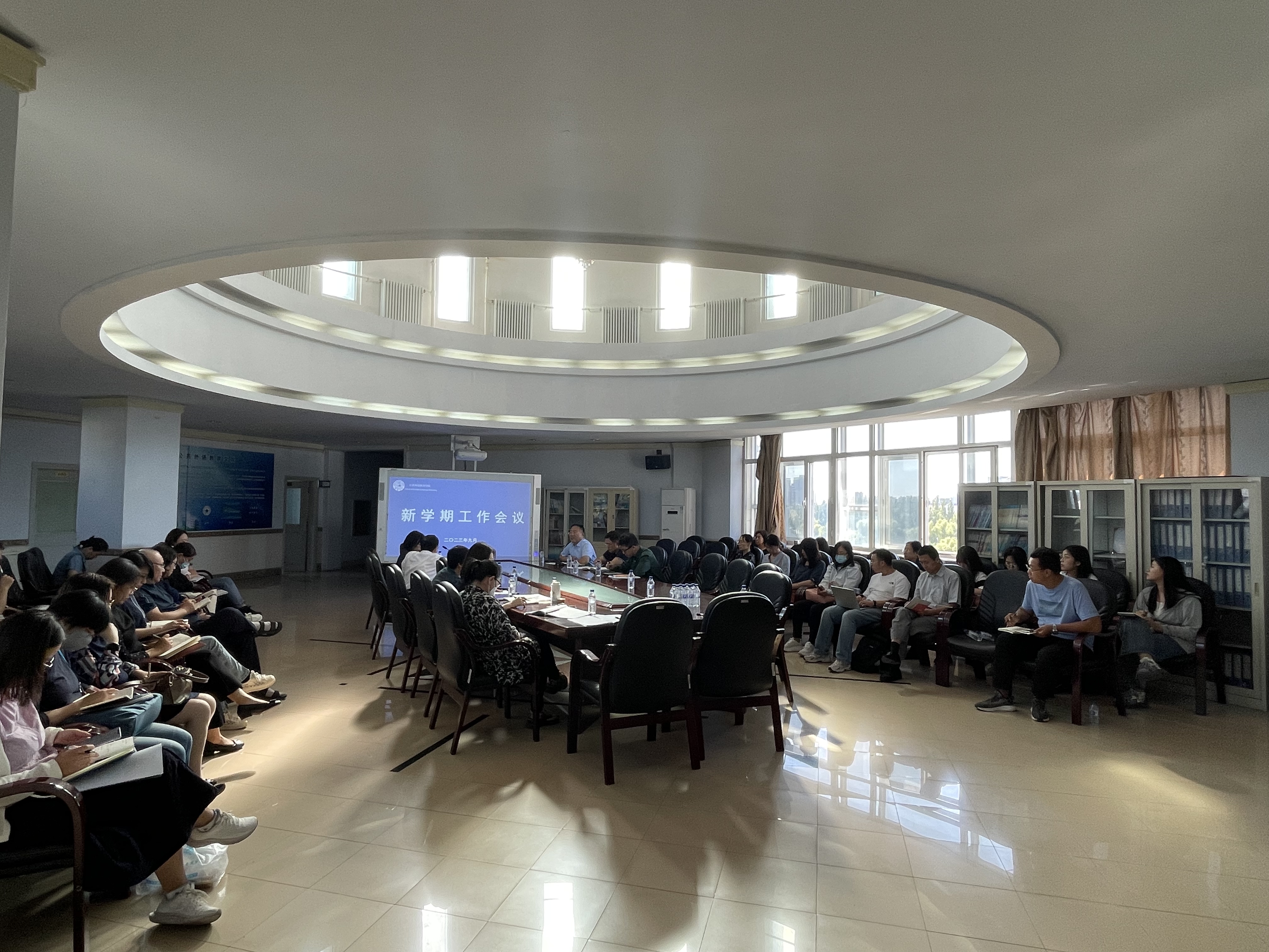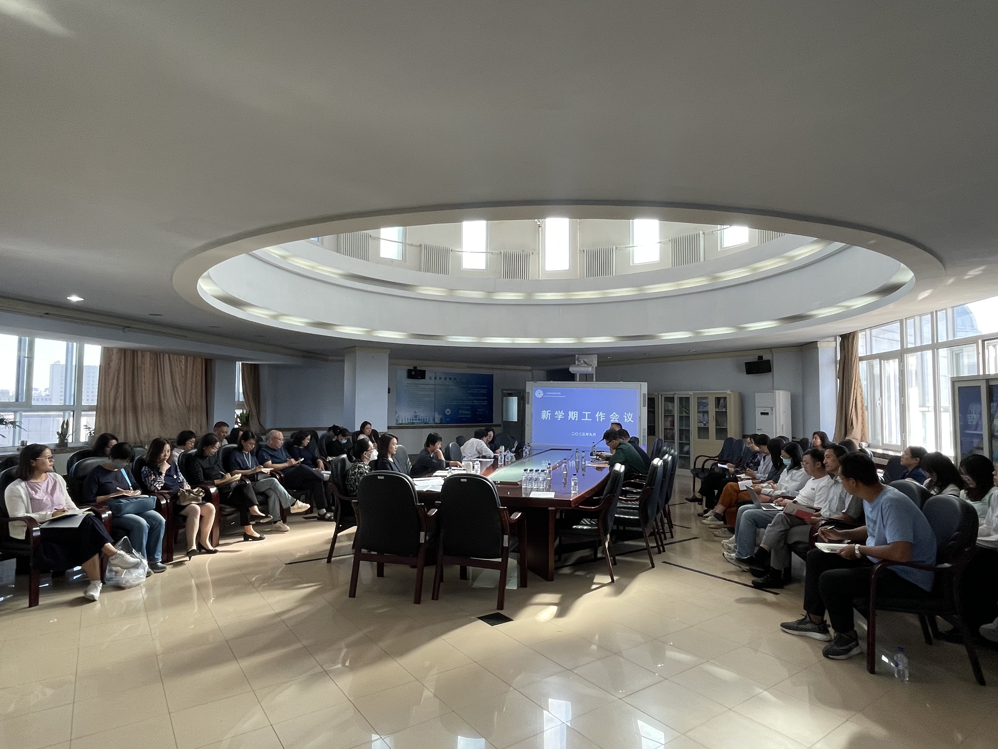 为保障新学期各项工作顺利开展,2023年9月14日下午,公共外语教育学院在外语楼六楼报告厅召开了新学期工作会议。学院领导班子成员各教研室领导以及全体行政人员参加了会议,会议由潘海英院长主持。