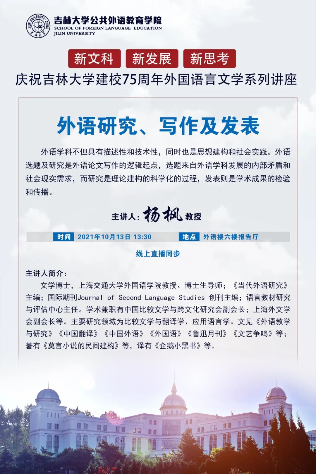 庆祝吉林大学建校75周年外国语言文学系列讲座预告:杨枫教授——外语研究、写作及发表