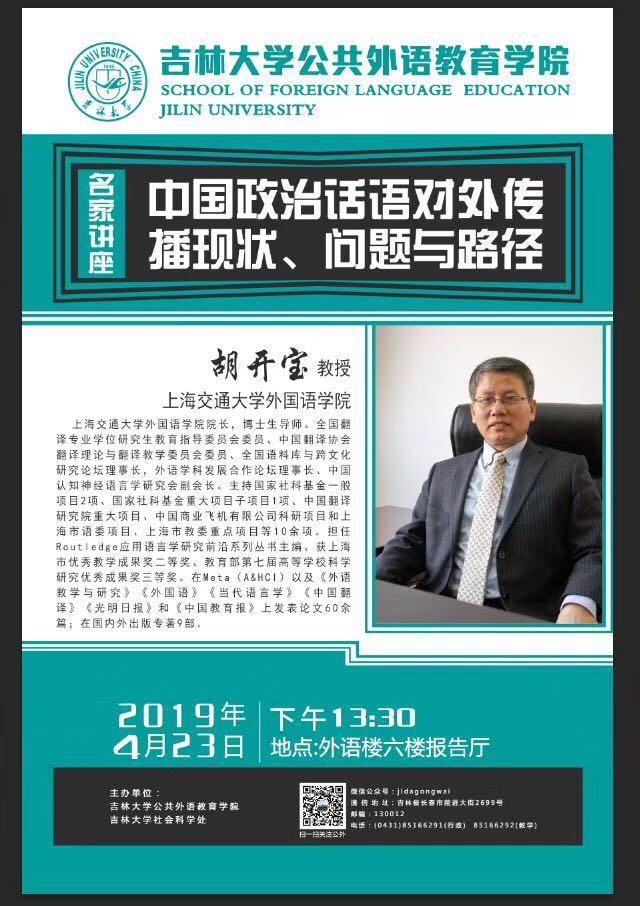 报告题目:中国政治话语对外传播:现状、问题与路径报 告 人:胡开宝 教授 上海交通大学外国语学院 院长讲座时间:2019年4月23日下午13:30讲座地点:中心校区外语楼六楼报告厅主办单位:华体会最新官方 吉林大学社会科学处