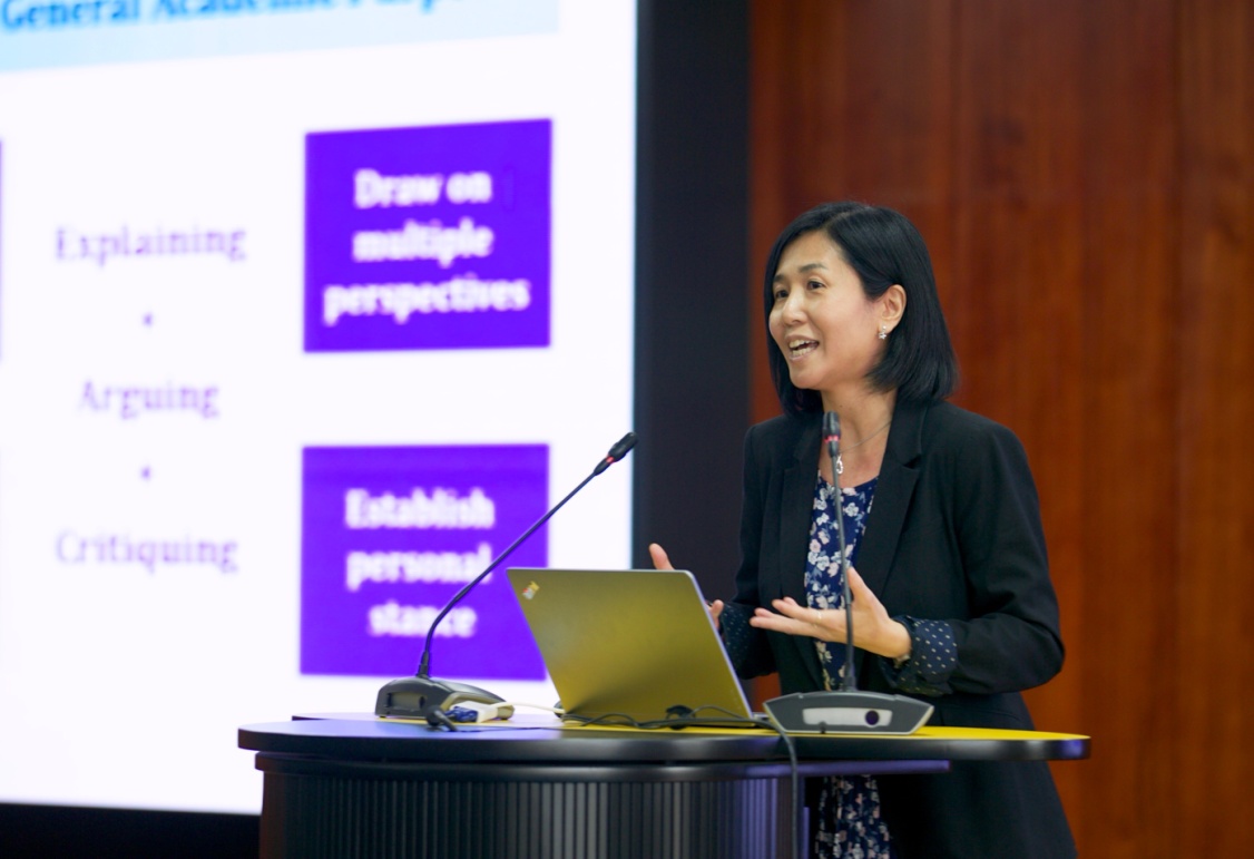 Lillian Wong博士做题为“English for Academic Purpose: Developing students’ academic literacy for university”的主题报告。她首先区别了EGAP(通用学术英语)与ESAP(专用学术英语),介绍了学术语篇的五大要素及通用学术英语课程的具体课程模块,最后她列举具体的语篇向听众讲解学术语言的使用。她的讲座对于有学术写作需求的学生及教师以及从事学术语篇研究的研究者都有很大的启发和帮助。