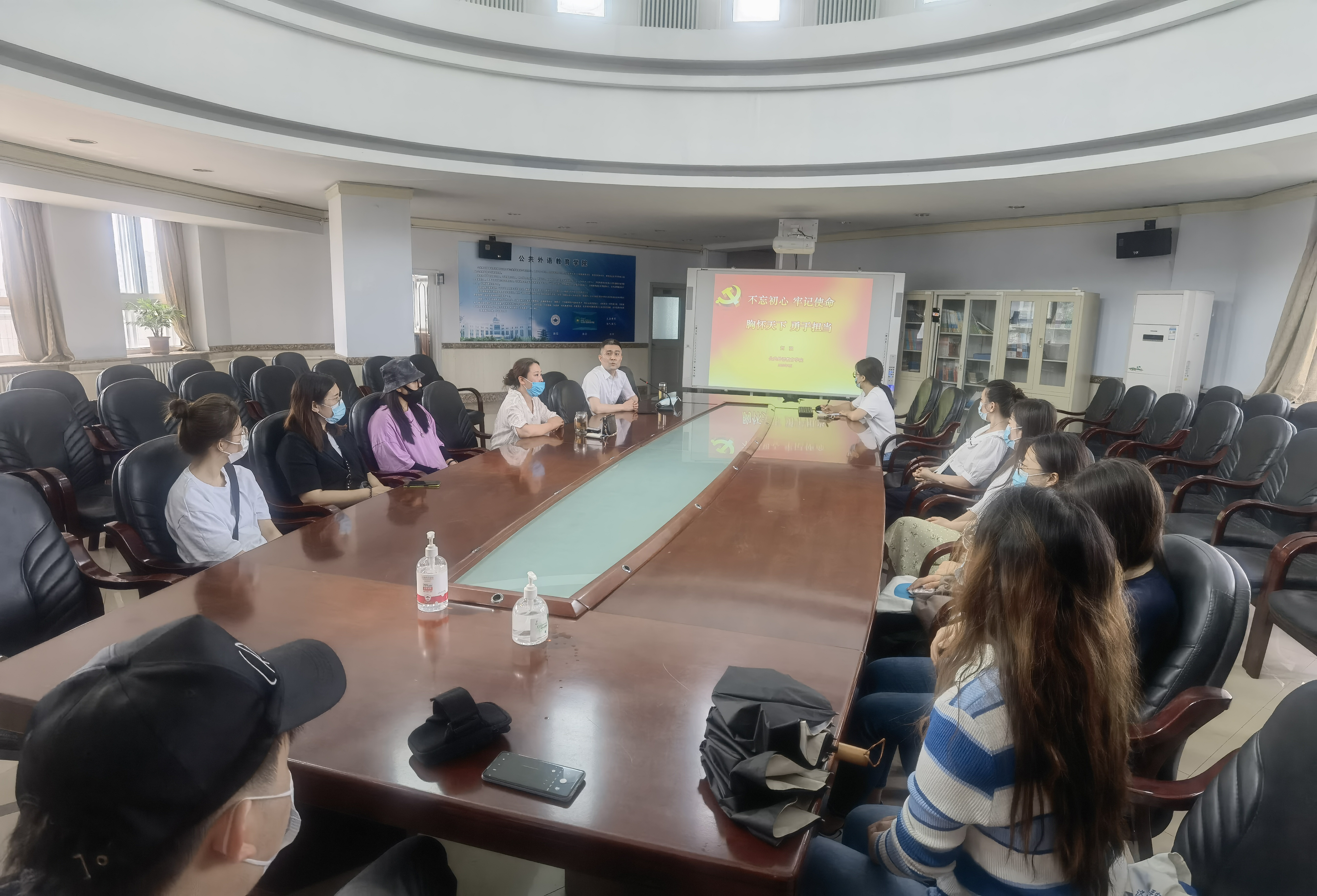 2022年6月17日上午9时,公共外语教育学院党委书记贺强在外语楼六楼会议报告厅为我院2022届研究生毕业生党员上了一堂以“不忘初心,牢记使命,胸怀天下,勇于担当”为主题的党课。此次党课由辅导员曾媛主持,党委副书记徐杰老师列席。全体毕业生党员通过线上线下相结合方式参加此次活动。