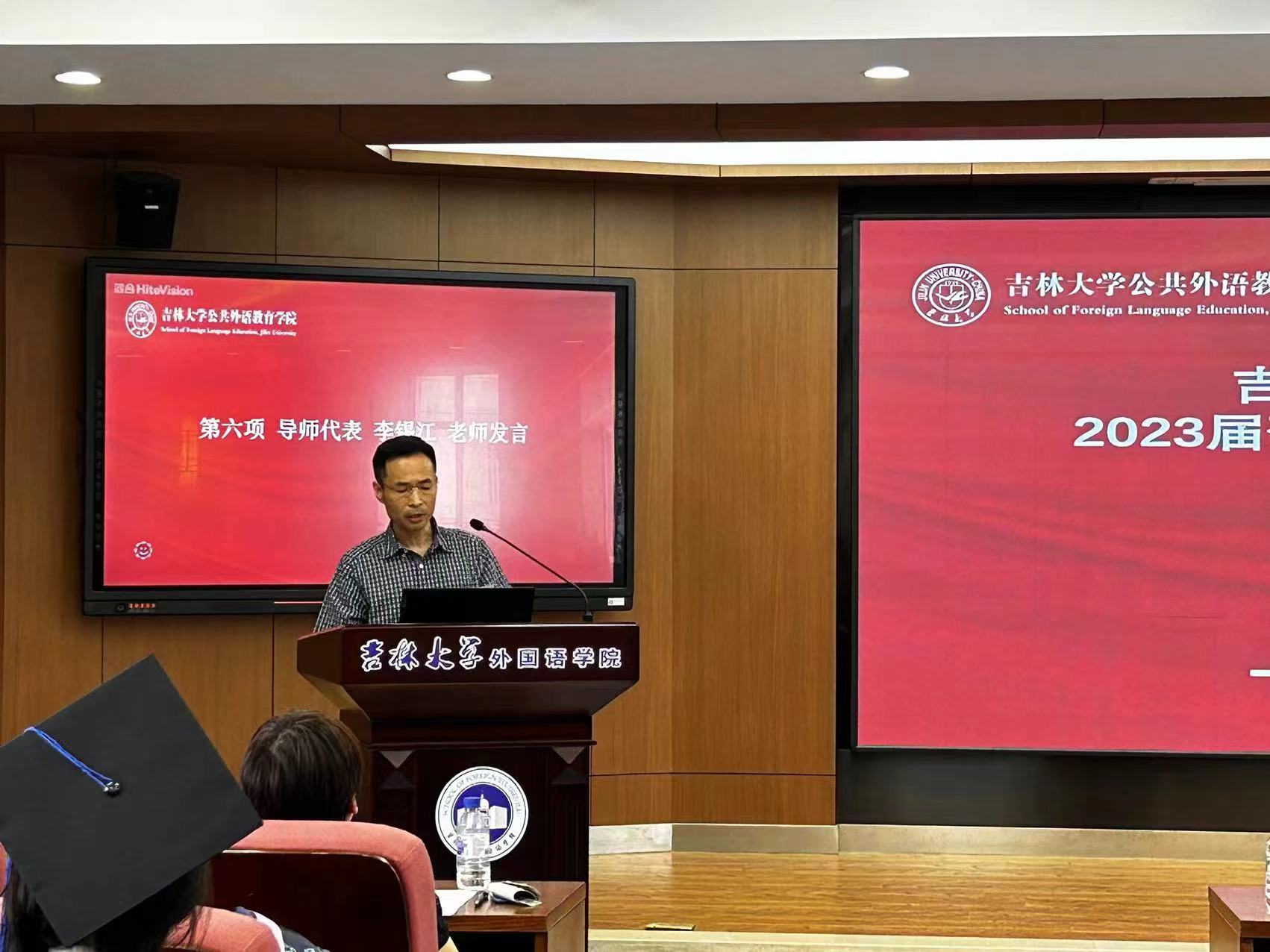 毕业典礼在雄壮的国歌声中拉开序幕,全体师生共唱国歌。姜峰副院长宣读了2023届研究生毕业生名单。接着学院学位委员会主任潘海英教授和学位委员会主任战菊教授为毕业生拨穗并授予学位。随后党委书记贺强宣读了公共外语教育学院2023届优秀毕业生名单。