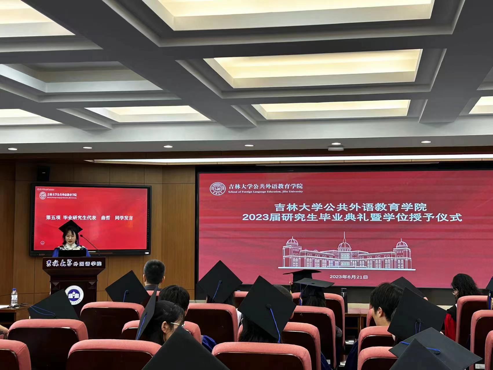 硕士研究生代表曲哲同学代表2023届全体毕业生向长期以来给予全心关怀、教导和帮助的领导示以最隆重的感谢,对老师的培育示以最崇高的敬意。她感叹时光瞬息,吉大公外见证了自己初生牛犊的盲目自信变得谦逊踏实,从肆掠青春的浮夸躁动变得务实奋进。三年的校园时光,是最美好的青春。满怀着对学院的不舍与感激,曲哲同学希望公共外语教育学院欣欣向荣、再谱华章,祝愿吉林大学再创辉煌。