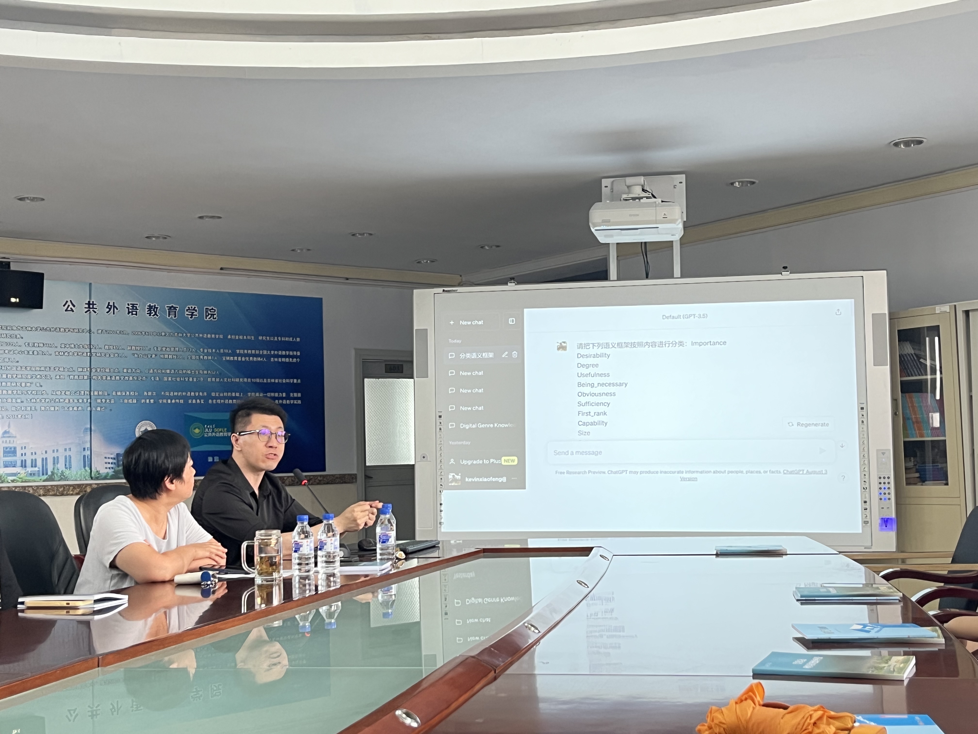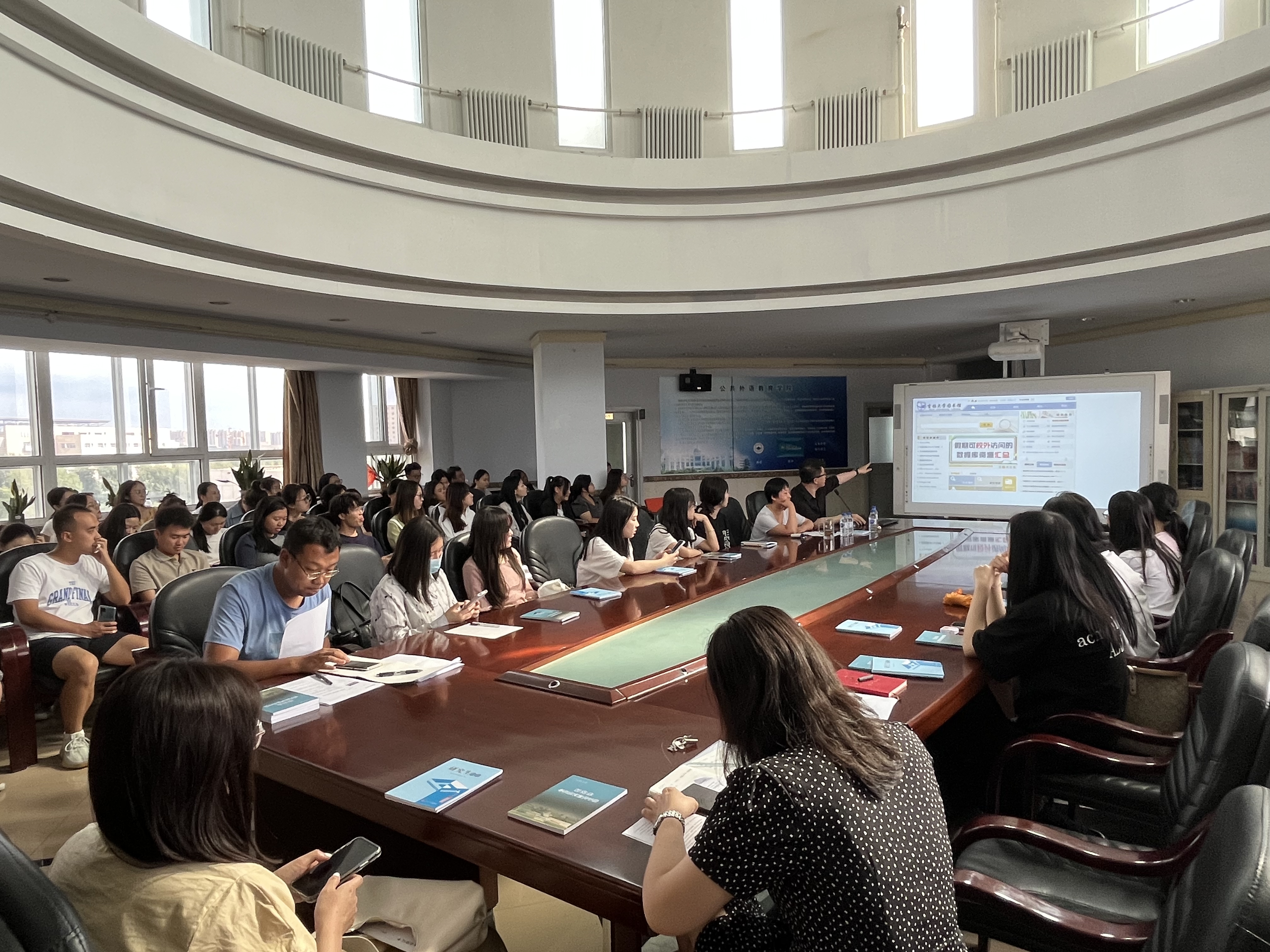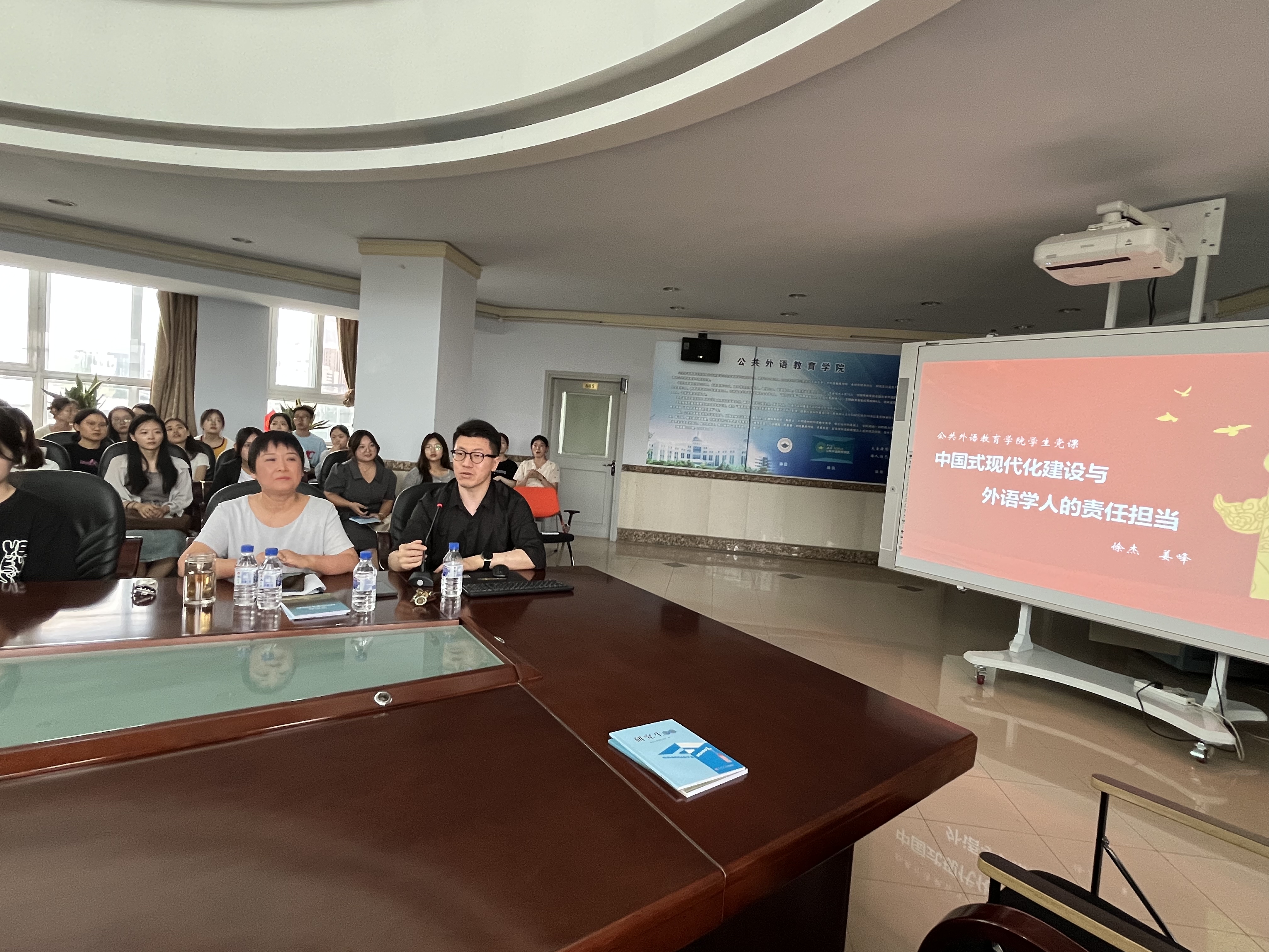 2023年8月25日下午,公共外语教育学院副院长姜峰为学院2023级新生讲授了一堂以“中国式现代化建设与外语学人的责任担当”为主题的党课,本次党课由党委副书记徐杰主持,教学秘书李萌、研究生辅导员林明帅参会,2023级全体研究生参加。