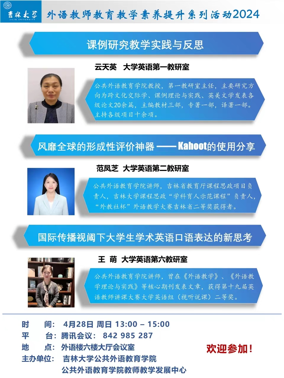 2024年4月28日,公共外语教育学院在外语楼六楼举行了外语教师教育教学素养提升系列活动。本次活动以问题为导向,针对学生的诉求以及教师在教学中遇到的难点痛点,邀请学院三位优秀骨干教师分享教学经验与心得,旨在促进外语教师队伍建设,提升大学外语教学质量。院长潘海英教授和学院教师参加了活动并进行了热烈讨论,来自国家级虚拟教研室的各校同仁线上参加了会议。