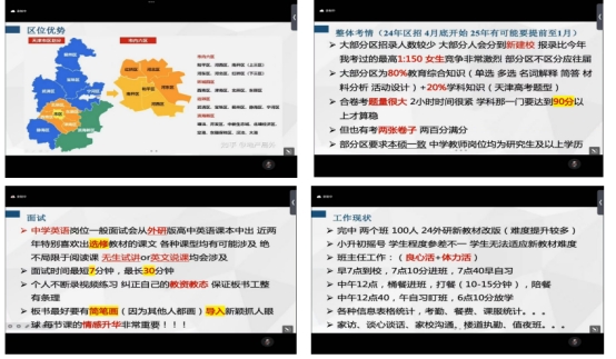 杨澜结合自身上岸天津地区教师编的经验,从区位优势、整体考情、笔试、面试以及工作现状五个方面分享自己的备考心得。她详细地分析了滨海新区的就业情况和考试难度,从笔试和面试两方面讲解了考试的形式和内容,帮助同学们深入了解了天津地区教师编的招聘要求。杨澜向同学们分享了自己的工作现状,并鼓励大家在求职期间一定要积极准备,敢于尝试。